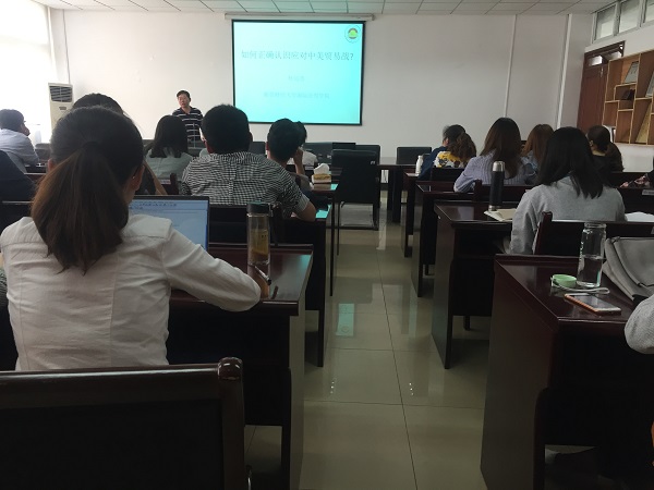 2018-05-10黑料吃瓜网 举办第16期青年学者论坛——我校副教授杜运苏做讲述“如何正确认识及应对中美贸易战”