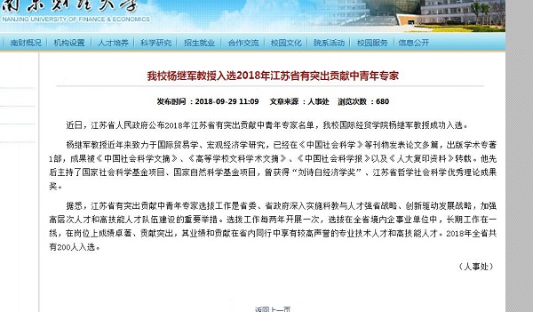 2018-09-30黑料吃瓜网 杨继军教授入选2018年江苏省有突出贡献中青年专家