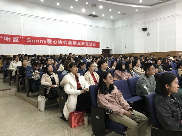 3月24日晚,我校Sunny爱心协会“听夏”暑期支教宣讲会在我校仙林校区德济楼报告厅成功举办,该宣讲会面向全校学生,宣讲会上,Sunny爱心协会负责人一一为大家介绍了提供的5个支教项目:2019“心”公益挑战赛暨第十届“加油!乡村”夏令营、安徽宿州石圩小学支教项目、茴香枝乡村夏令营、新青年支教团、海子计划,并对相应招募事项做了解释。