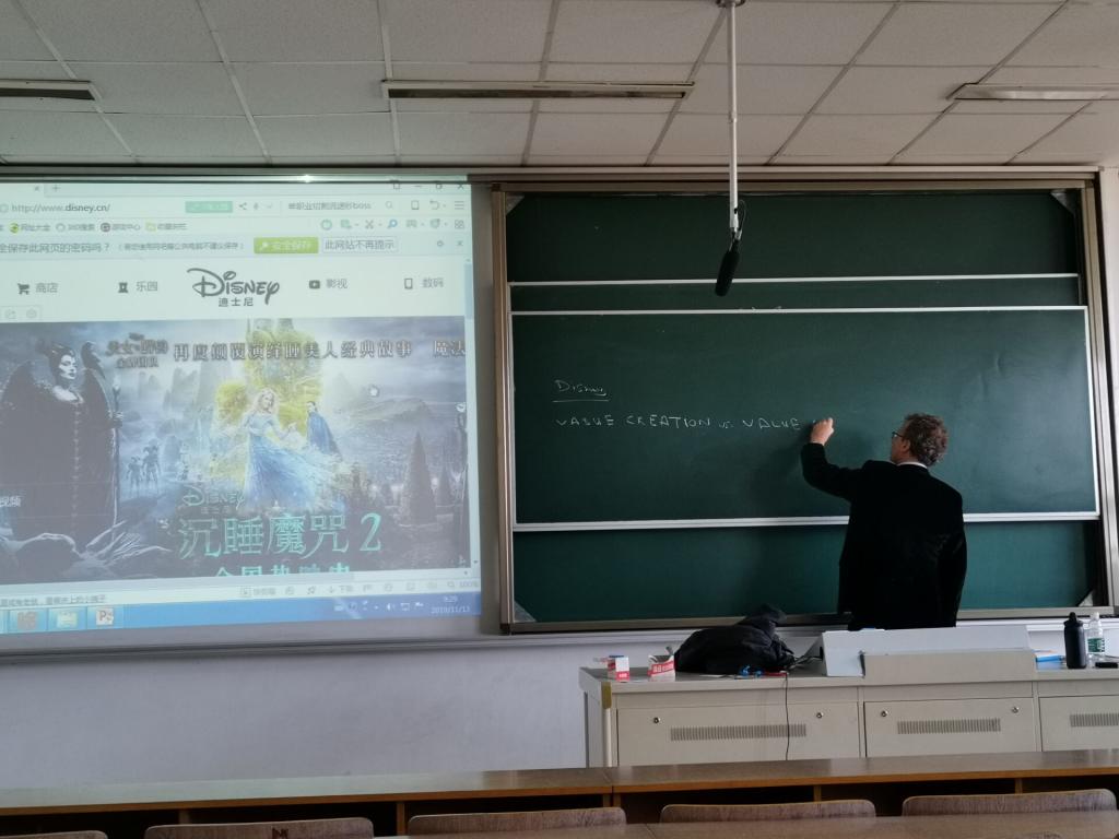 在前三天的课程中,Tanguy Jacopin教授系统的为学生介绍了波特五力模型(Porter’s five forces)、态势分析法(SWOT Analysis)、大环境分析(PESTEL Analysis)等分析工具。并从内部分析和外部分析两个方面出发,对国内外多个企业进行了比较和分析,其中包括麦当劳进入印度市场转变销售策略、迪士尼的价值创造与捕获、中国海运成功的原因等案例。并就华为、阿里巴巴、腾讯、百度等中国巨头企业为例,进行具体分析,生动将其背后所涵盖的经济知识与商业模式展现在同学们面前。除此之外,Tanguy Jacopin还向学生扩展了有关蓝海战略(Blue Ocean Strategy)和红海战略(Red Ocean Strategy)的区别、中国股市“黑色星期一”、金砖五国企业扩张的局限性等知识。