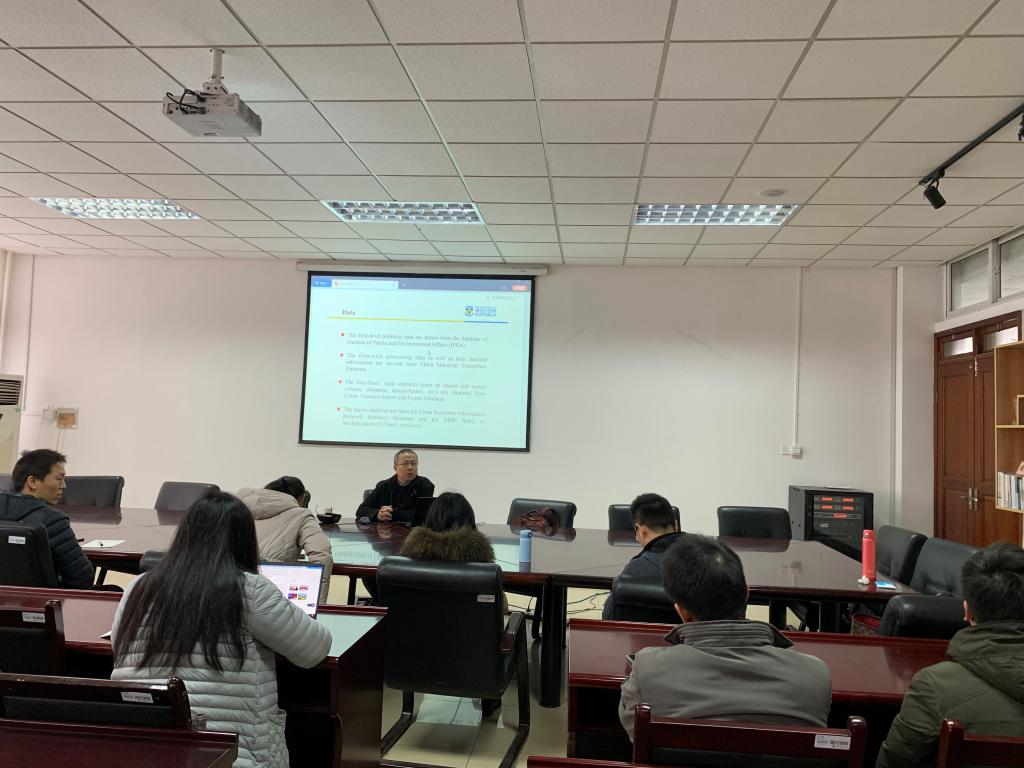 报告会上,吴延瑞教授重点分析了我国国内附加值出口及其与环境污染的关系,他从研究背景、研究方法,数据采集,建模计算,结果讨论等多个方面进行了深入讲解,他指出:国内增加值出口占出口总额的比例与企业污染排放负相关,这种关系在一般贸易方面比加工贸易更为深刻,其中,负面影响在东部和中部地区、技术密集型产业、外资企业和新企业中尤为普遍。此外,政府干预越小,产权保护越好,税负越轻,出口增加值与企业排污之间的负相关关系越强。会议的最后,国际经贸学院的与会师生就数据收集和控制变量问题与吴教授展开了讨论,并探讨了下一步合作研究的方向。