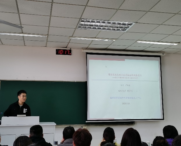 2023年3月13日上午9点-12点,第二十九期南京财经大学国际经贸学院紫金青年学者论坛在德经楼202教室成功举办。本次讲座由南京大学商学院金刚研究员做了题为《国家试点与地方试点融合的政策设计——基于营养教育扶贫项目的经验分析》的学术报告。我院部分老师和学生参加了此次讲座,座无虚席,场面热烈。