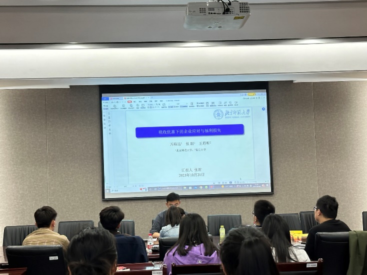 最后,北京师范大学的张尉博士汇报了题为《税收优惠下的企业应对与福利损失》的文章。文章在政府实施减税降费政策的背景下,构建企业行为理论模型,从理论上分析“减半征税”背景下的企业行为策略,并基于全国税收调查数据,利用聚束方法,估计企业的应纳税所得额反应,计算应税利润弹性;利用“donut-hole”断点方法,分析门槛值附近企业的经营指标变化,判断企业调整型位的类型;最后分析“减半征税”政策的福利影响,估算企业行为应对带来的福利损失。张尉博士最后指出结论:通常而言,减税政策会降低税对企业生产行为造成的扭曲。但作为一种规模偏向性政策,所得税减半征收也会对企业行为产生额外的扭曲,造成明显的效率损失。因此在指定规模偏向性税收优惠政策时,应该充分考虑企业的行为应对:加强税收征管,减少企业规避行为;合理确定优惠税率和政府门槛值,努力降低政策带来的负面激励。研讨现场进行了激烈的研究与探讨,我校荆晶和曾晶老师对此篇文章的汇报进行了点评并给予宝贵的建议。