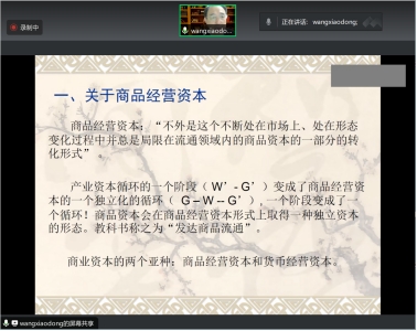 12月27日晚上6:30,依托和聚焦贸易经济国家一流专业建设点的现代商贸流通前沿系列讲座第7期以线上方式进行,中国人民大学王晓东教授应邀作了主题为“关于《资本论》中的流通经济思想”的学术报告。国际经贸学院师生参加,本次讲座由贸易经济系杨向阳教授主持。