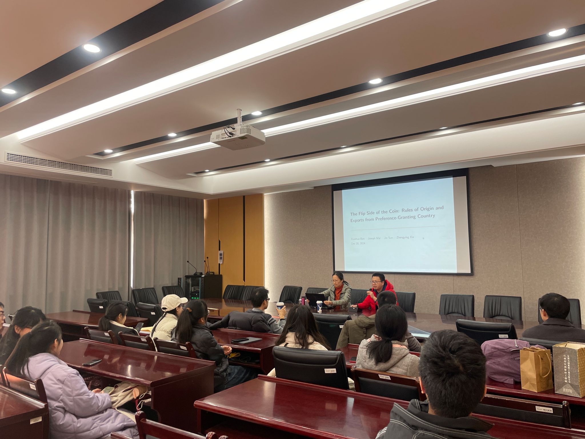 12月20日下午,上海财经大学商学院讲席教授鲍晓华应本院之邀,莅临我院发表题为“The Flip Side of the Coin: Rules of Origin and Exports fromPreference-Granting Country”的学术报告。此次报告于德经楼308会议室举行,由陈启斐副院长主持,学院部分青年教师及硕、博研究生参与聆听。