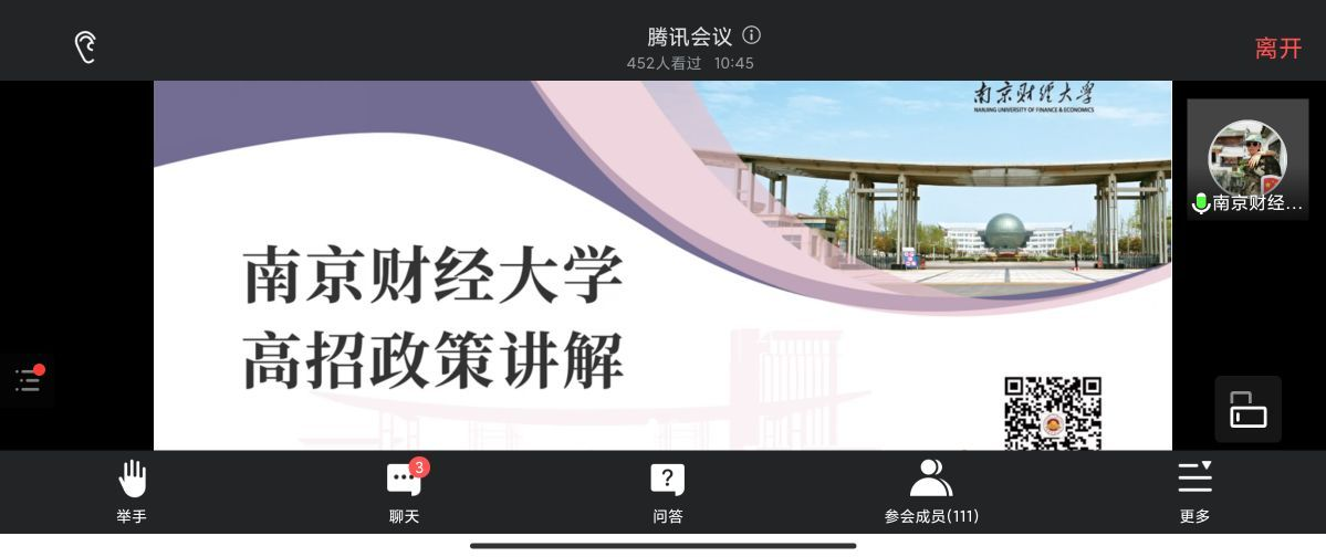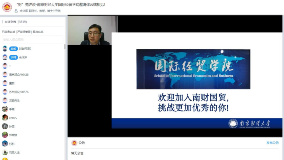 为了扩大学校的知名度和影响力,吸引优秀高中毕业生报考我校,南京财经大学国际经贸学院利用中国教育在线直播平台,以及腾讯会议平台开展3场线上宣讲直播。