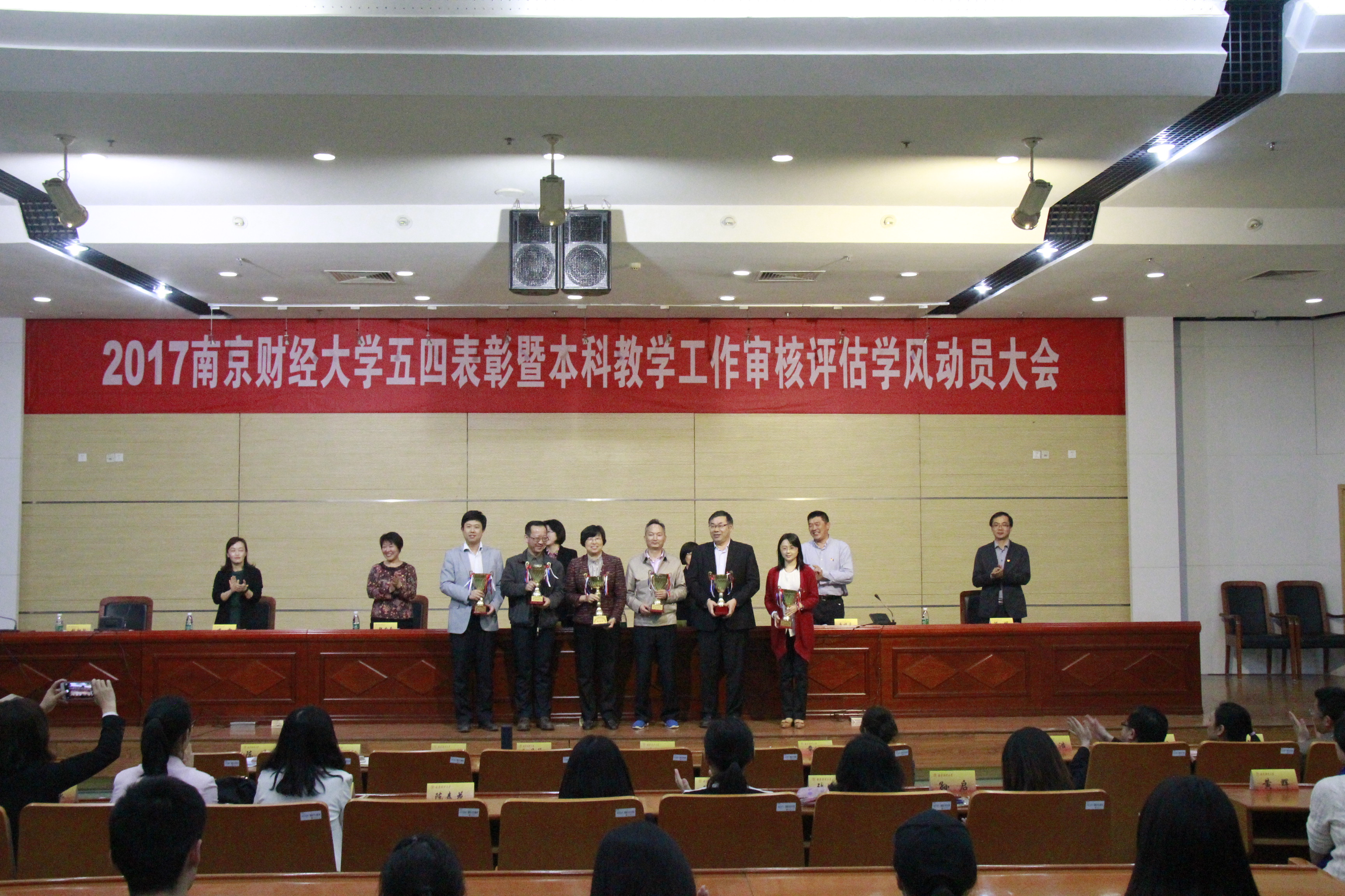 4月27日下午,2017年南京财经大学五四表彰暨本科教学工作审核评估学风动员大会在我校仙林校区图书馆报告厅隆重举行,副校长邱伟芬出席会议,党校办、党委组织部、党委宣传部、党委学生工作部、党委保卫部、团委、教务处负责人,各学院党委(总支)书记、副书记,各学院团委书记、副书记、专职团干,校学生会主席团成员,各学院学生会主席,团员代表,获奖人员代表参加了此次大会。