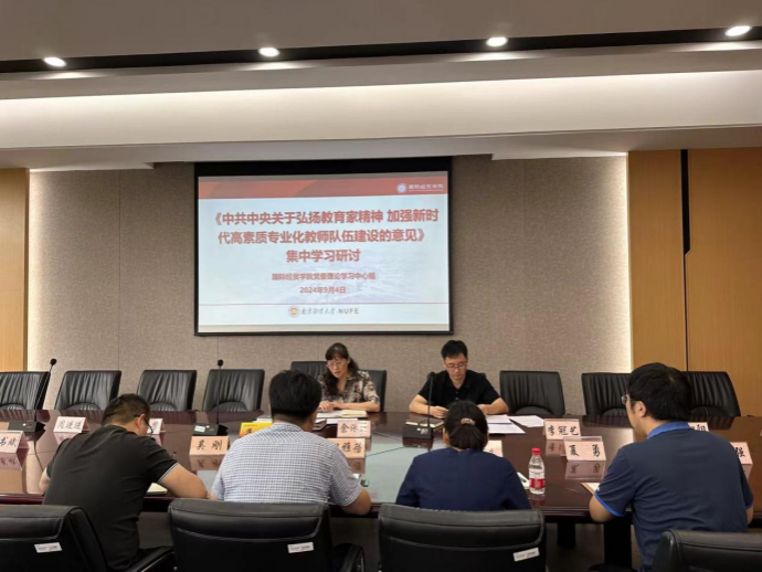 9月4日上午,国际经贸学院党委理论学习中心组在南京财经大学仙林校区德经楼308会议室召开学习会,围绕《中共中央国务院关于弘扬教育家精神加强新时代高素质专业化教师队伍建设的意见》开展集中学习研讨,学院全体院领导参加了学习会并做了重点发言,会议由院党委书记周亚芳主持。