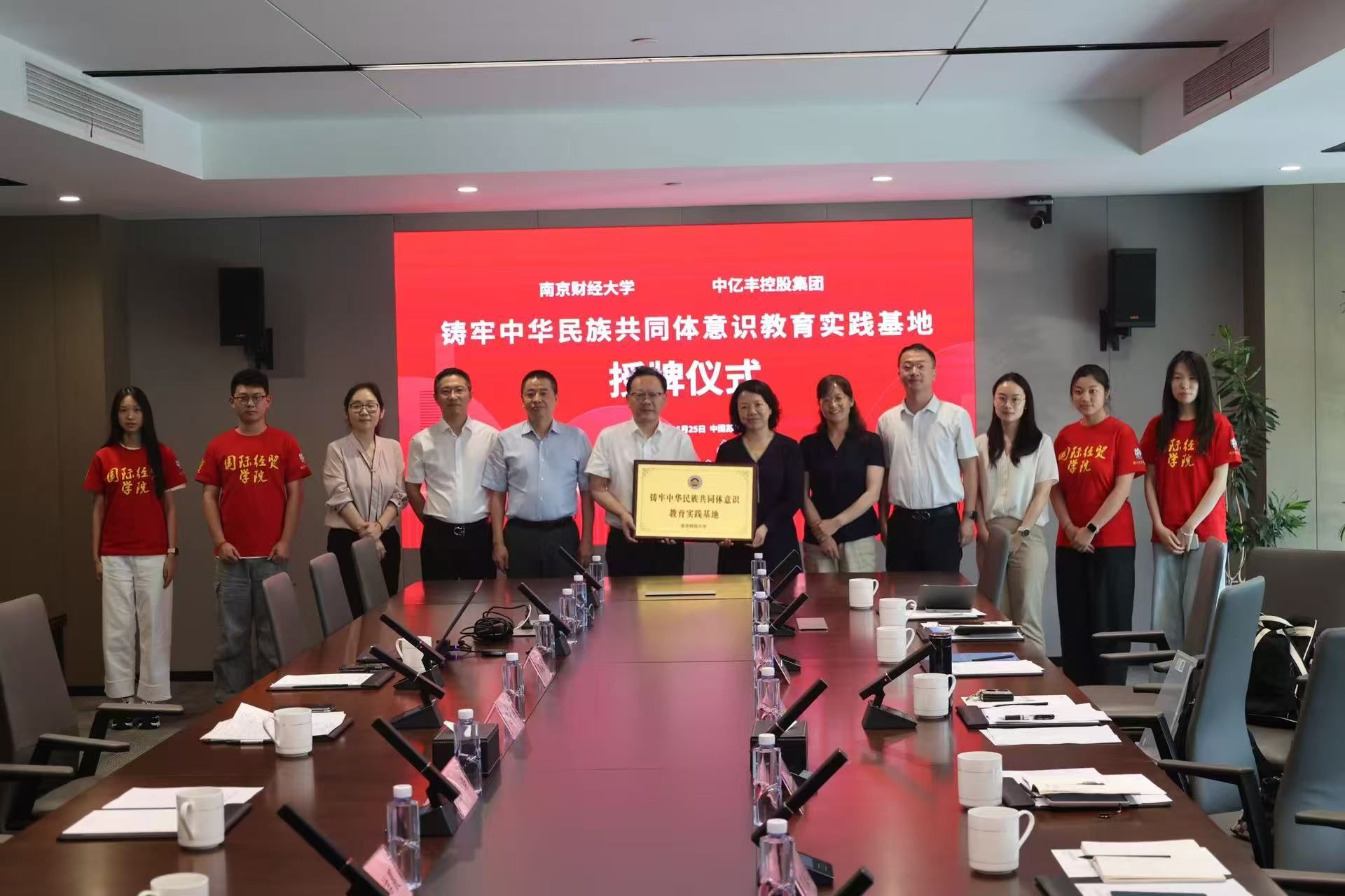 宫长义董事长对李玉琴部长一行表示欢迎。他表示,“中华民族共同体意识是企业发展的根脉。”近年来,中亿丰在推动民族地区产业升级、帮扶各民族儿童“走出大山看世界”等方面持续打造亮点品牌。与省属高校携手探索铸牢中华民族共同体意识教育的新路径意义重大,希望双方以共建实践教育基地为桥梁,合力谱写民族团结进步“连心曲”。李玉琴部长介绍了学校基本情况,对中亿丰大力支持高校铸牢中华民族共同体意识教育事业表示感谢,对企业在促进民族团结进步方面作出的贡献表示钦佩。她希望双方携手将企业家社会责任、高校育人使命、民族团结进步梦想,熔铸成一条“共学、共践、共进”的道路。周亚芳书记简要介绍了合作共建设想,并围绕产学研融合、深化校企合作、人才共育等深入交流。随后,宫长义董事长接受国际经贸学院“运河文脉连民心 民族团结共前行”大学生实践团采访,结合个人经历向同学们介绍了推动民族团结进步工作的初心与愿景,并勉励青年学生将“小我”梦想融入中华民族一家亲、同心共筑中国梦的伟大实践中。李玉琴部长与张浩副书记共同为“南京财经大学铸牢中华民族共同体意识教育中亿丰控股集团基地”揭牌。