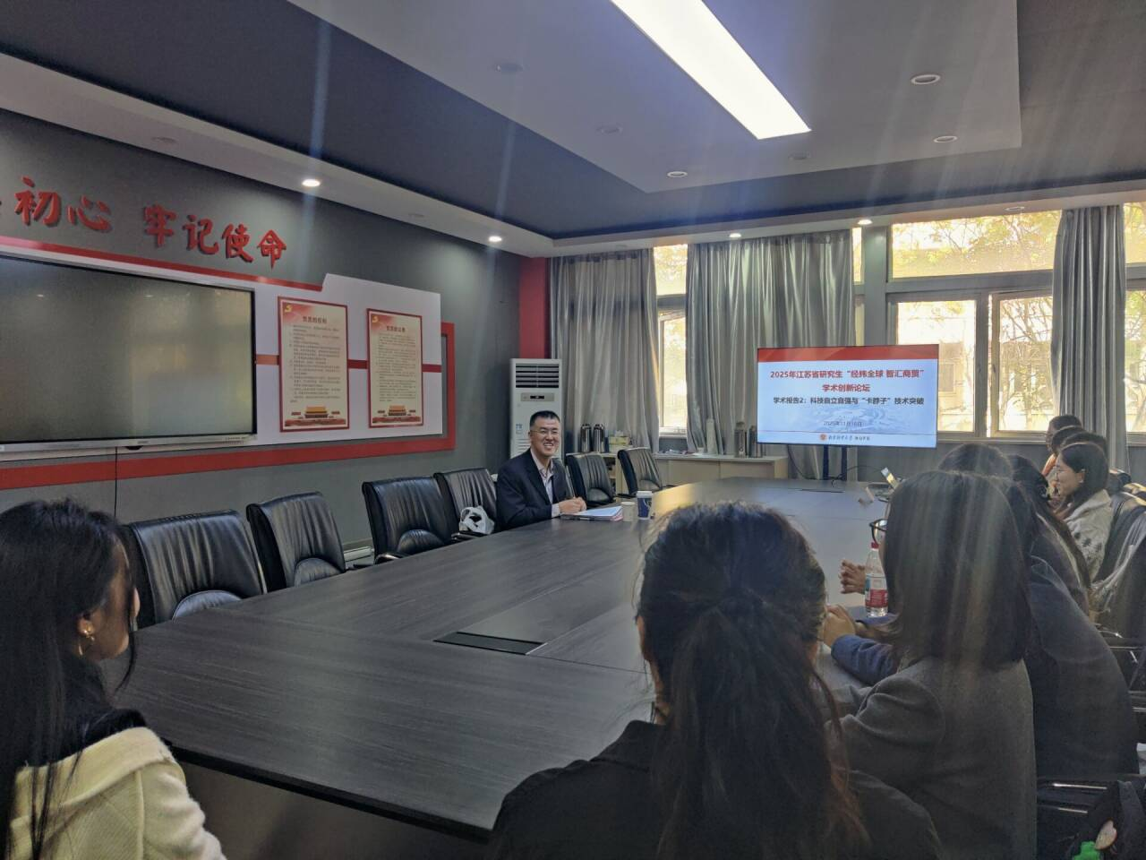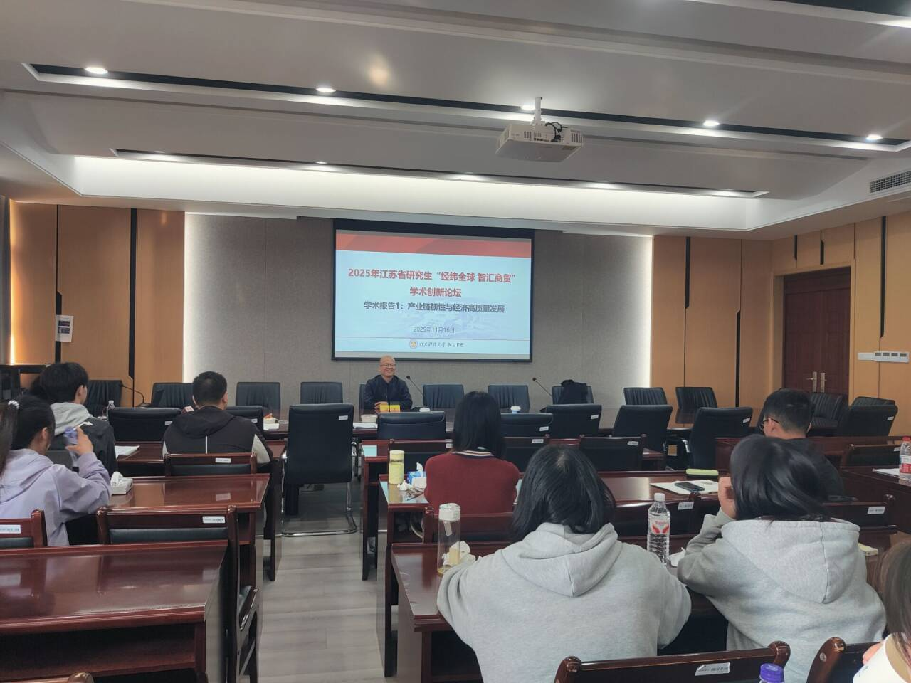 2025年11月16日,由江苏省经济学类研究生教育指导委员会主办、南京财经大学国际经贸学院承办的江苏省研究生“经纬全球智汇商贸”学术创新论坛在南京财经大学仙林校区成功举办。论坛由国际经贸学院副院长陈启斐教授主持,江苏省经济学类研究生教育指导委员会秘书长张成教授和南京财经大学国际经贸学院院长余泳泽教授分别致辞,学院盛情邀请6名知名专家学者莅临指导,大会聚焦全球经贸格局变革、数字经济与贸易转型等前沿议题,为服务经贸领域新发展格局贡献学术智慧,并围绕研究生高质量培养问题开展专题讨论。