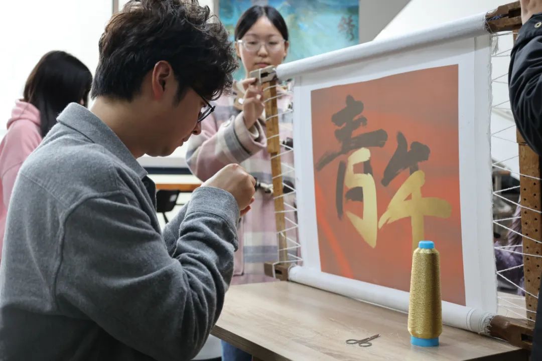 同学们兴致高涨,轮流体验,巧用金色的丝线勾勒出绣布上的“青年”二字,成功完成了作品的勾边工序。贸经2201班的陈晨说道:“用苏绣绘制'青年'让我知道了当代青年要重视耐心的培养,在苏绣绣制的过程中,一针一线都需要静下心来,而作为青年的我们在日常生活中也要学会做到静下心来,对自己选择的事情充满持之以恒的热爱,对自己坚持的事情要耐心做到最好。”
