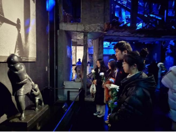 踏入纪念馆正门,青马班学员们的神情不约而同的凝重起来,矗立在眼前是一座座庄严而肃穆的雕塑,似乎一砖一瓦仿佛都在诉说着历史的凝重。这些雕塑有体无完肤,痛苦万状的老人;有以死洗去自身所受污浊的少女;有婴儿趴在母亲的尸体上吮吸乳汁,更有背着被炸死的奶奶的十三岁逃难少年!