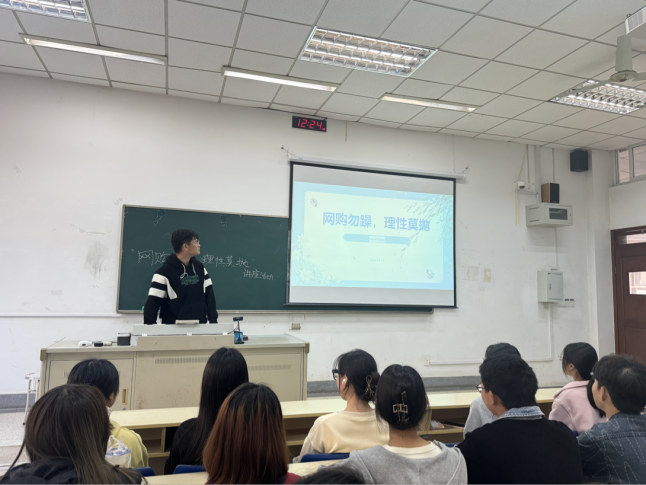 为引导同学们理性消费,树立健康的消费观,11月11日中午,我院在徳经楼110教室举办了“网购勿躁,理性莫抛”分享会,本次活动邀请到了国际经贸学院的蒋佳成同学作为分享嘉宾。