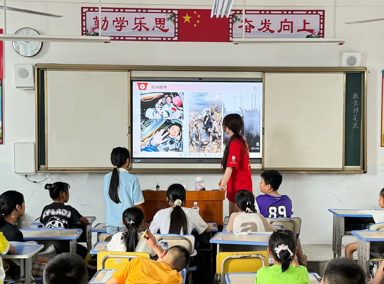 “我们是共产主义接班人,继承革命先辈的光荣传统……”在党史学习教育课上,稚嫩的童声与播放的原版歌曲形成奇妙和声。支教团队特别设计的红色歌曲环节,让孩子们在学唱经典歌曲中感悟信仰力量。当唱到“没有共产党就没有新中国”时,许多孩子自发加入手势,教室里挥舞的小手与教室外的国旗交相辉映。