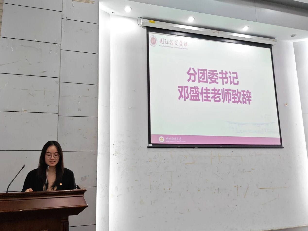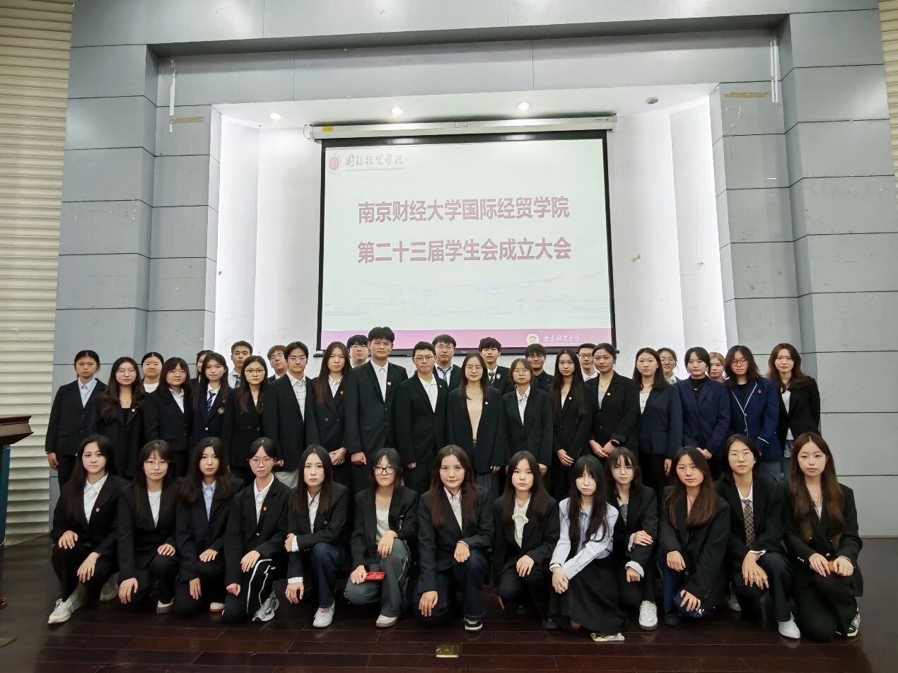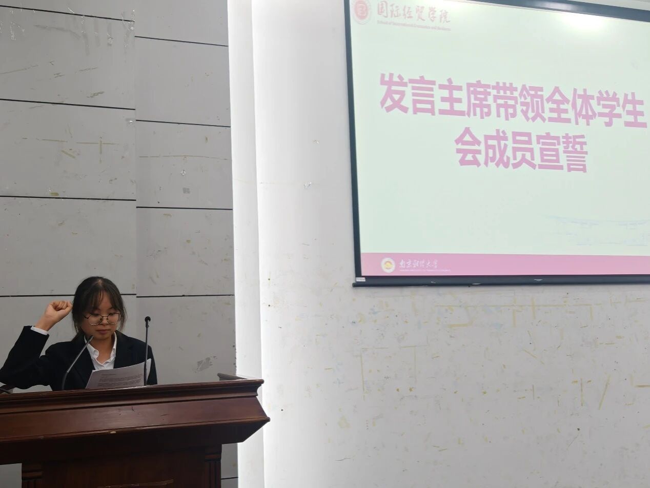 雏凤清于老凤声,新程今启聚群英,2025年10月14日晚,南京财经大学仙林校区国际经贸学院第二十三届学生会成立大会在德经楼二楼报告厅召开。学院团委邓盛佳老师出席本次会议,分团委副书记凤昱博、范晶晶、张宇梦、蒋佳成,学生会主席程婧尧、董苏红、施宇同与全体学生会成员参会。此次成立大会由综合事务中心部长周添翼主持。