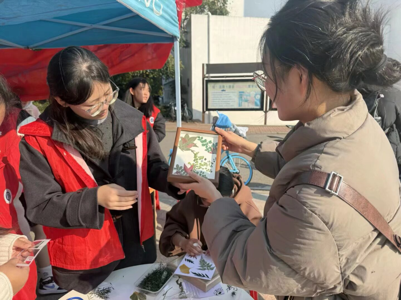 香囊制作区更是人气爆棚,成为活动亮点。“小雪时节湿气重、寒意增,艾叶能祛湿散寒,藿香可化浊防感,大家可根据需求自由搭配!”志愿者手持药材包,向围拢的同学们逐一讲解食材功效,同步示范香囊装袋、系绳技巧。同学们俯身细细闻辨艾叶、藿香、薄荷等药材气味,认真挑选心仪食材,不时与志愿者交流搭配方案。“我想加些薄荷,提神清咽还能辅助防感!”一名同学话音刚落,志愿者便贴心为其添入适量薄荷干花。大家将药材装入精美香囊袋,或互相协作系挂绳,或用装饰配件点缀创意,现场欢声笑语不断,在动手实践中加深了对传统防感知识的理解。