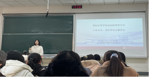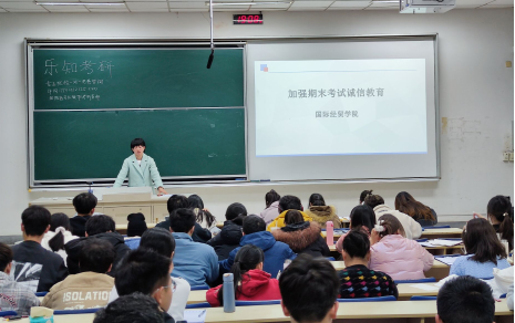 为响应学校学院考风考纪教育动员会活动,增强学生对诚信考试的重视,进一步加强同学们的考风考纪,构建安全诚信校园,保证期末考试的顺利进行,倡导同学们“端正考风、严肃考纪、文明答题、诚信应考”。国际经贸学院开展了系列诚信教育主题班会。