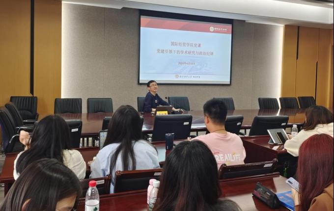2024年4月18日,南京财经大学国际经贸学院在德经楼308会议室举办“党建引领下的学术研究与政治纪律”专题党课,本次党课由国际经贸学院院长、政治辅导员余泳泽教授主讲。