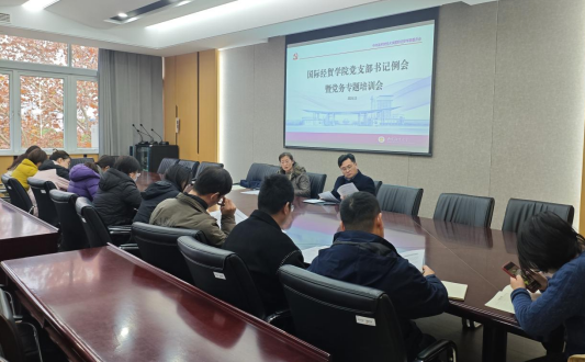 12月10日,国际经贸学院召开党支部书记工作例会暨党务工作者培训,对近期党务工作进行总结和布置。学院党委书记周亚芳、党委副书记周进进,学院组织员、兼职宣传员、兼职纪检员和各支部书记参加了会议。会议由组织员刘紫月主持。