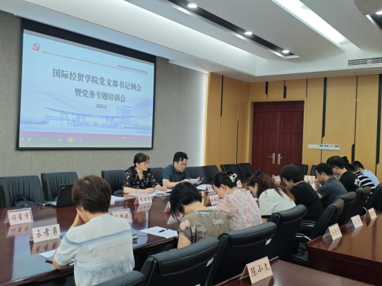2025年9月10日下午,国际经贸学院党支部书记例会暨党务工作者培训会在德经楼308会议室召开。学院党委书记周亚芳、党委副书记周进进,学院组织员、兼职宣传员、兼职纪检员和各支部书记参加了会议。会议由组织员刘紫月主持。