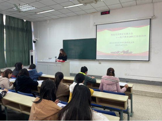 2021年12月11日下午,南京财经大学国际经贸学院第四党支部在德经楼106室召开预备党员转正支部大会,讨论本支部王佳佳同志预备党员按期转正事宜,支部大会由第四学生党支部书记董敏主持,支部政治辅导员余泳泽副院长全程参加,支部应到党员24人,实到党员24人,其中有表决权的正式党员6人。