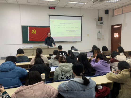 2021年12月1日,南京财经大学国际经贸学院本科生第一党支部在德经楼108教室召开党员支部大会,讨论接收李荟等6名发展对象为预备党员事宜,支部大会由本科生第一党支部书记孙绪华主持,政治辅导员张阳军书记全程参与大会并指导工作。支部大会应到党员42人,实到党员42人,其中有表决权的正式党员8人,实到正式党员8人。