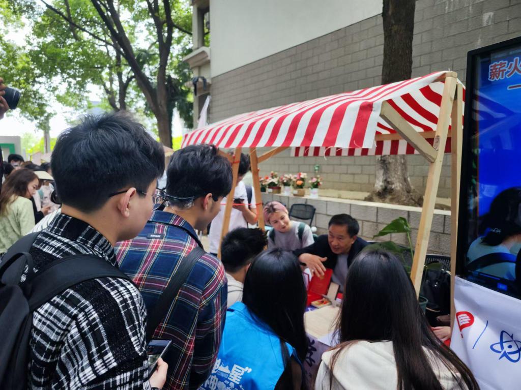 战争时期的好人好事报、《铭记实案录》回忆录、由击落的敌机残骸融制的飞机模型等老物件、闪亮如新的军功章……,刘树铭老师一一做着展示介绍,同学们纷纷被吸引前来。当刘树铭老师谈及所在部队受命开采放射性矿石时,院“两弹一星”精神宣讲团成员罗光照感慨道:“除‘两弹一星’元勋外,还有无数中国战士艰苦奋斗、无私奉献,为祖国核事业的发展奋力前行。我们要向前辈学习,成长为能吃苦有信念、堪当重任的新时代青年。”国贸2202姆娜瓦尔·买吐地对《铭记实案录》回忆录中“我们欠你一只羊”好奇地追问细节。刘树铭老师回忆起一位连长为感谢回族人民帮助部队击落敌机,在战争结束后千里送羊兑现诺言,结下回汉两族深厚淳朴的战斗情谊的往事。听至此,作为疆三代的贸经2301曾佳仪有感而发,“我的奶奶是上海的第一批支边青年,作为一名妇产科医生,与新疆人民同心协力,共建美好家园。战争年代的民族情谊延续至今,之后也将在新一代青年的奋斗中得以传承。” 刘树铭老师还与同学们一起畅谈学习生活中的趣事与烦恼,探讨入党初心与人生规划。老党员讲得眉飞色舞,同学们听得聚精会神,频繁的交流互动引来了更多同学的围观。摊位前人头涌动、热闹非凡。