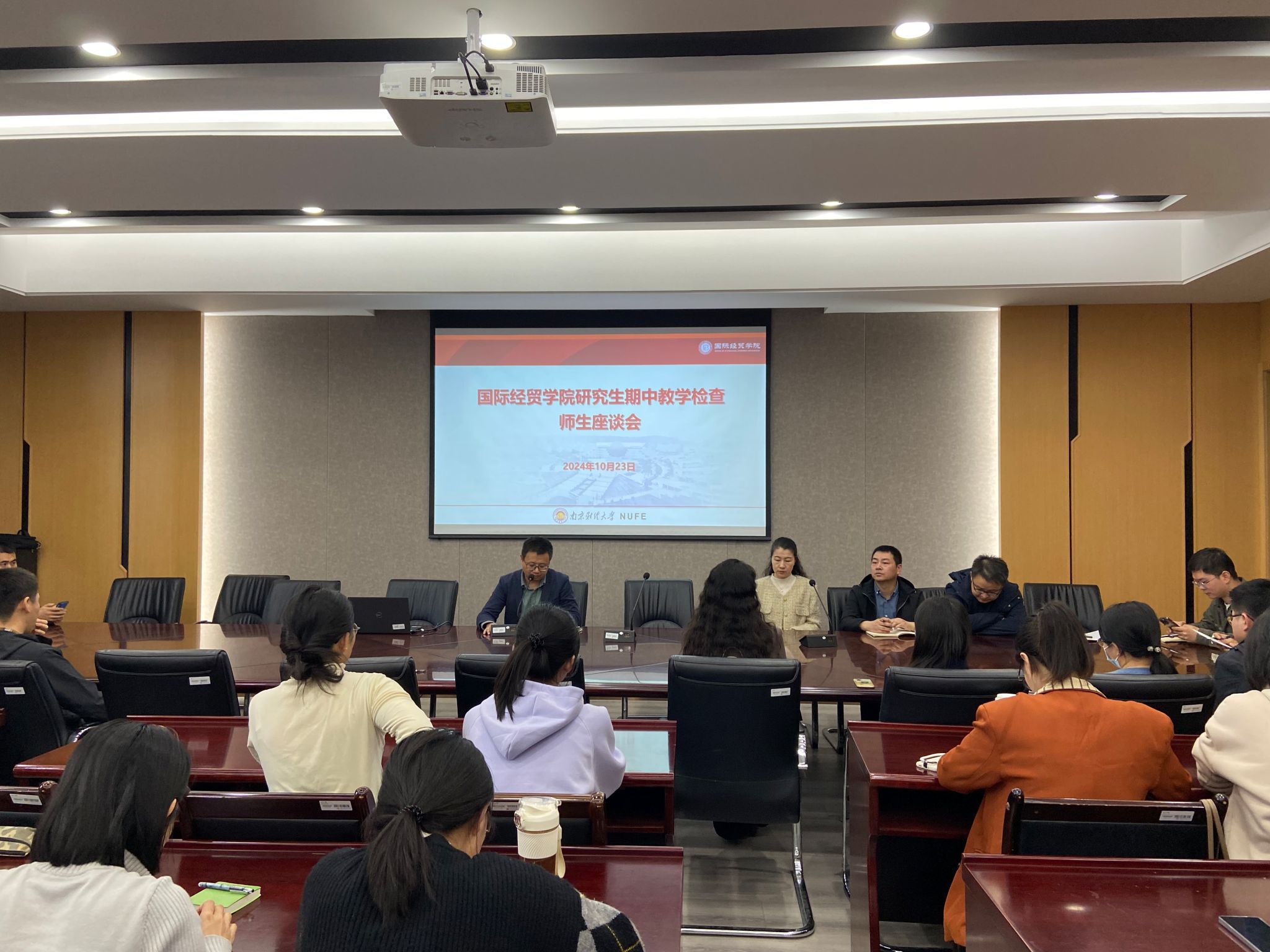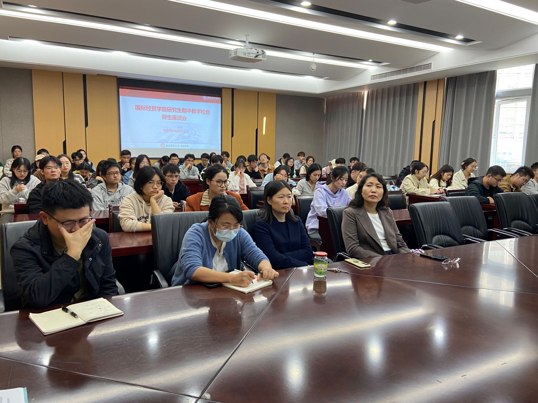 10月23日下午,根据学校研究生院统一部署,国际经贸学院(江苏产业发展研究院)在德经楼308会议室组织开展2024-2025学年第一学期研究生期中教学检查座谈会活动,会议由陈启斐副院长主持,学校教学督导、相关学科负责人、研究生任课教师代表、研究生秘书以及2024级博士、硕士研究生代表出席了本次会议。