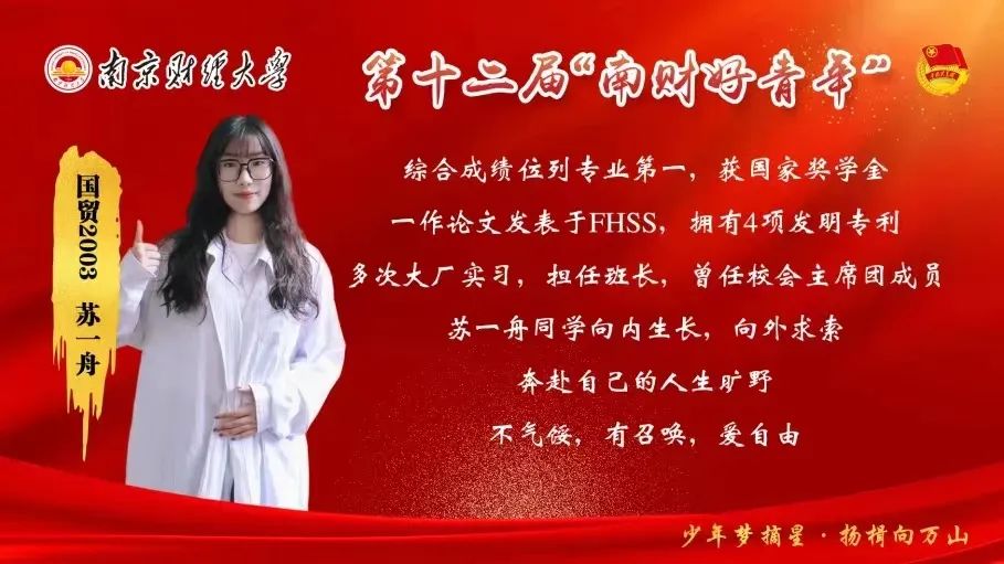 国际经贸学院优秀学子国贸2003苏一舟始终秉持“立定脚跟做事,放开眼孔读书”的精神品质。学业上,力求博学明辨—专业排名第一,荣获国家奖学金、及优大、优干等多个荣誉称号。竞赛科研中,踏浪而行,曾参加了帝国理工—皇家艺术学院联合暑校以及台湾东吴大学交换项目,以全A成绩优秀毕业;担当大学生创新创业训练计划和互联网+大学生创新创业大赛主持人,以第一作者身份发表论文并产出四项发明专利;参加Ocale跨境电商比赛,荣获国家级特等奖。实践活动中,务实奋进,连续两年参加迎新与学代会志愿活动,并担任校学生会主席团成员,荣获优团干、优干、优志等多个荣誉称号。苦尽甘来终有时,一路向阳待花期,正是其不断向内生长,向外求索,方能脱颖而出。