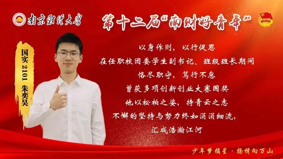 12月4日晚,由共青团南京财经大学委员会,南京财经大学学生会主办的第十二届“南财好青年”人物评选活动在答辩后圆满落下帷幕。我院优秀学子国实2101朱奕昊、国实2001郑孔迪、国贸2003苏一舟荣获十强,并一举夺得了“南财好青年”称号。