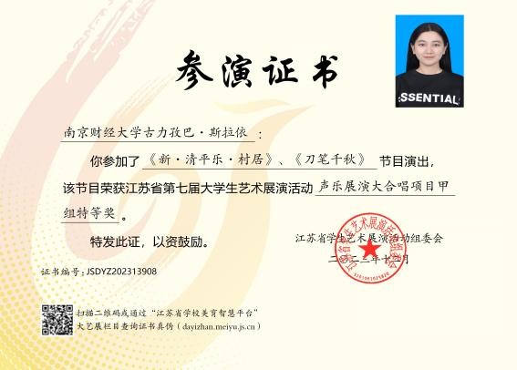 声音落入声音,于是有了最美的合唱与和弦。大一时,古力孜巴·斯拉依加入了校合唱团组织,在刘念老师的指导下,她学习到了很多合唱技巧,包括如何正确发声、如何头腔共鸣,这帮助她提高个人能力,也让团队合作更加默契和专业。2023年,古力孜巴·斯拉依所在的合唱团在学校举办了音乐会,并多次去校外进行演出,在该年年底参加了江苏省第七届大学生艺术展演活动。荣获了两项省级奖项,一项国家级奖项,古力孜巴·斯拉依也因此荣获了校长奖学金。