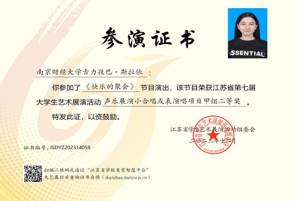 2024年十月,古力孜巴·斯拉依参加第三届“外教杯”江苏省大学生“用外语讲好家乡故事,用中文讲好中国事”演讲比赛,她在视频中介绍到新疆的壮丽的天山山脉、澄澈赛里木湖和喀纳斯湖、色香味俱全的美食烤全羊、抓饭和大盘鸡、以及其背后延绵至今生生不息的喀什文化,她的精彩表现让她在校赛中获得一等奖,并被推荐至省赛,荣获省赛二等奖。