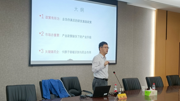 在对产业政策的研究中,陈钊教授的研究发现大中小型企业在接近获取税收优惠的研发强度时,其会计报表中的其他管理费用都会存在一个断层,该现象的产生是由于企业想达到优惠税收的研发强度,从而将其他管理费用“转变”为研发费用,使得其研发强度达标,这说明,我国的投研支出是存在一定的水分的,这个水分通过估算大约为24.2%。在对市场环境的研究中,陈钊教授以新兴的无人机行业为例,发现上游产业基础更好,更有利于无人机企业进入,且高质量的上游产业基础能够激励下游无人机产业从消费级向工业级转型。同时也发现,当一个城市无人机上游产业基础更好的时候,这个城市的无人机企业更可能在劳动力市场上有好的表现,并且在金融市场上更可能获得融资。针对中国在关键核心技术领域面临的“卡脖子”问题,陈钊教授首先利用机器学习的算法,识别和预测“卡脖子”行业和产品技术领域,发现从企业所有制来看,无论进口还是出口,“卡脖子”行业更多是外资企业在做,其次是民营企业,因此无论是从接近技术前沿角度,还是从内循环角度来讲,“卡脖子”产品要突破技术前沿,得靠民企。最后,对于中国如何走向科技前沿?陈钊教授建议要有恰当的政策设计,要充分发挥市场的作用,重视和鼓励民企发展,继续坚持高水平的对外开放。