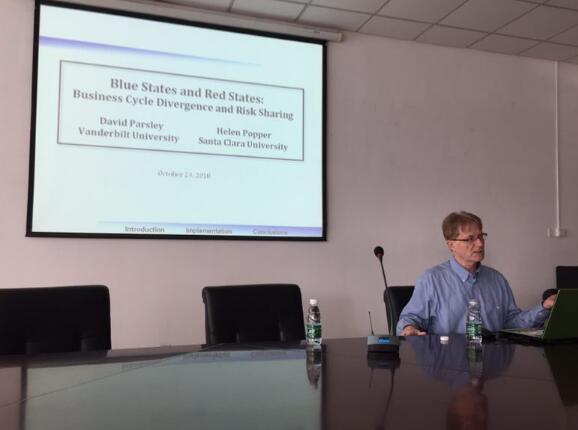 10月23日上午,应国际经贸学院邀请,美国范德堡大学欧文商学院David Parsley教授在仙林校区德经楼308会议室作了题为“Blue States and Red States: Business Cycle Divergence and Risk Sharing”(“蓝州”和“红州”:商业周期差异与风险分担)的讲座。讲座由国际经贸学院院长宣烨主持,学院青年教师以及研究生聆听了讲座。