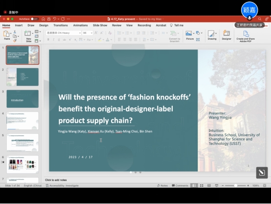 2023年4月17日上午,应国际经贸学院邀请,上海理工大学王颖嘉副教授做了题为“Will the presence of ‘fashion knockoffs’ benefit the original-designer-label product supply chain?”线上学术讲座,国贸学院管理科学与工程等专业研究生和部分老师及学生参加了此次讲座。