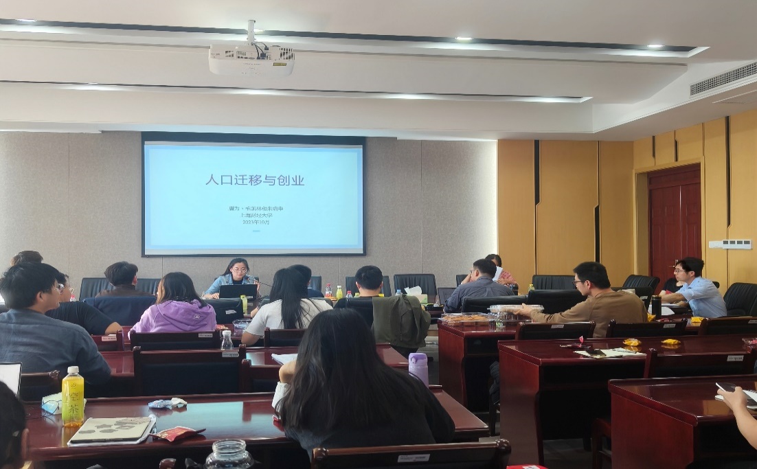 第三位演讲人是来自上海财经经大学的毛凯琳博士,她的汇报题目是《人口迁移与创业》。文章主要聚焦于两个问题,外来人口在多大程度上促进城市就业;以及外来人口的创业活动如何受到地方营商环境的影响。在变量创新上,她通过将农业冲击与移民网络相结合构建工具变量来处理人口迁移的内生选择问题,并在此基础上构建截面回归模型进行实证分析,实证分析证明,外来人口的迁入不仅增加了劳动力供给,也通过创业活动增加劳动需求;其次,只有适当降低当地市场进入壁垒,创造更好的营商环境,才能充分发挥移民的创造效应,促进地区经济发展。在汇报结束后,唐保庆教授、李松林教授和余泳泽教授先后对文章进行点评并提出宝贵的建议。
