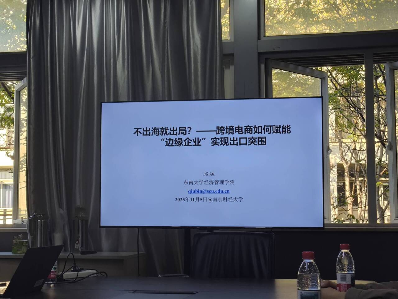 2025年11月5日下午3:00,东南大学国际经济研究所所长邱斌教授莅临我院学术前沿论坛,为师生带来“不出海就出局?——跨境电商如何赋能‘边缘企业’实现出口突围”的专题学术讲座。讲座由国际经贸学院谭用教授主持,我院部分青年教师和硕博研究生参与。