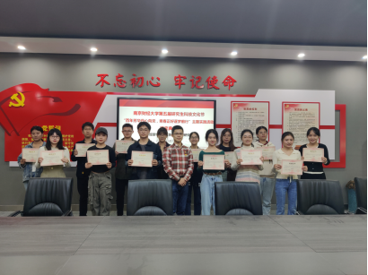 为迎接党的二十大胜利召开,庆祝中国共产主义青年团成立100周年,由研工部、研究生院主办,国际经贸学院、江苏产业发展研究院联合开展第五届研究生科技文化节“百年芳华丹心向党,青春正好逐梦前行”主题实践活动。2022年7月至10月,同学们积极参与了“我与旗帜合个影”、校外走访调研、“喜迎二十大”系列活动,活动参与度高,成效显著。2022年10月12日,本次活动颁奖典礼在德经楼206举行,国际经贸学院李贲老师、张东霞老师及全体获奖同学参加。