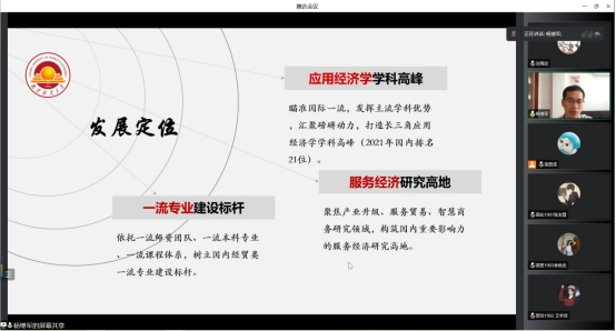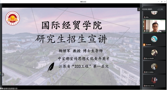 为使学生系统全面地了解本院研究生招生政策,9月21日下午,国际经贸学院线上开展了研究生招生宣讲会。会议由博士生导师、中宣部宣传思想文化青年英才、江苏省“333工程”第一层次人才杨继军院长主持,19届本科生参与会议。杨院长从培养条件、学科简介和招生形势三个方面,介绍了我院的学科特色、师资优势、科研成果、人才培养质量及就业情况等,详细解读和分析了2023年招生形势。