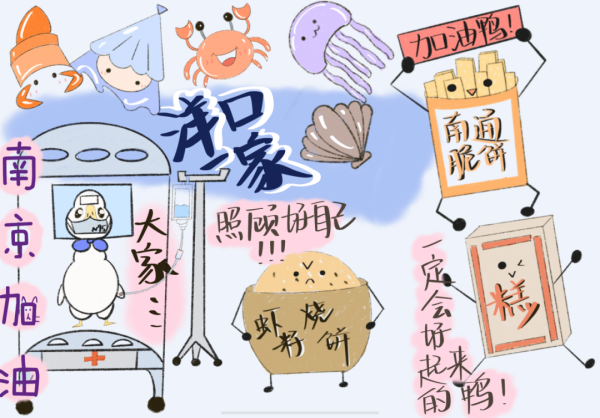 “麻辣小龙虾来了,盐水鸭挺住!”国贸2003班的钟莹同学来自距离南京八百多公里的湖南长沙,当看到疫情新闻后,她立刻想到用这样一幅画来为南京加油打气。画中描绘了一只生病的盐水鸭躺在病床上,但它并不孤独,窗外有麻辣小龙虾、臭豆腐、茶颜悦色等一起为它加油。“南京加油!”“我们都在!”简简单单的两句话,却是此刻无数南财学子心中对南京这座古城的真切鼓舞。