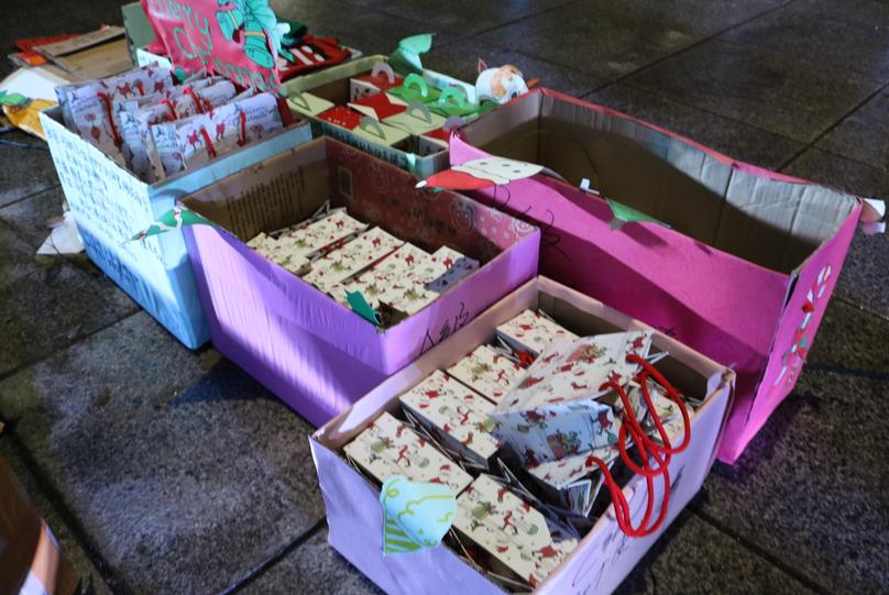 活动前,工作人员在学校各个角落放置了一千根荧光棒,以此作为兑换不同等级礼物的筹码,提前装扮好的圣诞老人也引来同学们的踊跃合影,为活动的开始做好了充满节日气氛的前期铺垫。寒冷的天气并没有阻挡活动参与者的热情,在活动开始后不出半小时,在参与者的细心寻找下,用于兑换奖品的荧光棒就被找出。活动结束后,不同价值的礼物在兑换现场,尽数被参与者领取,传递了属于平安夜的喜悦。