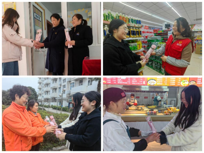 此外,国际经贸学院的志愿者们在三八节前夕为我校女教职工送上鲜花与祝福贺卡,以表敬意。志愿者们去到了宿管站、超市与食堂,细心留意才发现,朴素的中国女性在点点生活中展现着巾帼不让须眉的美丽。食堂的阿姨们在为接下来的晚餐忙碌着、保洁阿姨仔细清扫着教室走廊的卫生,宿管阿姨们则是在倾听着来访同学们的烦恼与心事,并不时给她们提供鼓励与建议。她们在平凡岗位上默默坚守,维护了校园生活的和谐与有序。“阿姨您工作辛苦了,祝您妇女节快乐,这是为您准备的鲜花,祝您工作顺利,心想事成!”