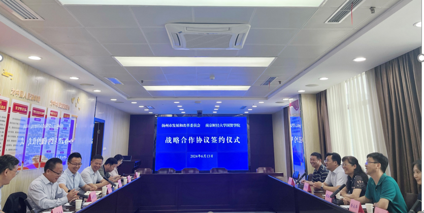 6月13日下午,国际经贸学院与扬州市发展和改革委员会(以下简称“扬州市发改委”)成功举办“一院一地”校地战略合作暨党建共建协议签约仪式。我院党委书记周亚芳、院长余泳泽、扬州市发改委副主任孙景亮、服务业处处长王斌出席签约仪式。扬州市粮食局、扬州市发改委投资处、财经处、机关党委等部门以及学院副书记周进进、副院长徐圆、黄大年教工党支部副书记李宏亮等参加签约仪式。此次协议成功签约,标志着我院在“一院一地”校地战略合作方面迈入新台阶。