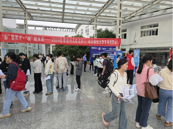 为进一步促进2025届毕业生就业,拓展毕业生就业渠道,10月15日下午,由中共徐州市委组织部(市人才办)、徐州市人力资源和社会保障局、南京财经大学主办,中共徐州市云龙区委组织部(区委人才办)、徐州市云龙区科技镇长团、徐州市云龙区人力资源和社会保障局、南京财经大学就业创业指导中心和国际经贸学院承办的“‘彭’聚英才·‘城’就未来”2024秋季徐州名校名所行(南京财经大学专场)招聘会在大学生活动中心举行。国际经贸学院党委书记周亚芳,学生处副处长、大学生就业与创业中心主任李慕原,国际经贸学院党委副书记周进进深入会场与用人单位和求职生交流,详细了解用人单位和毕业生的需求。
