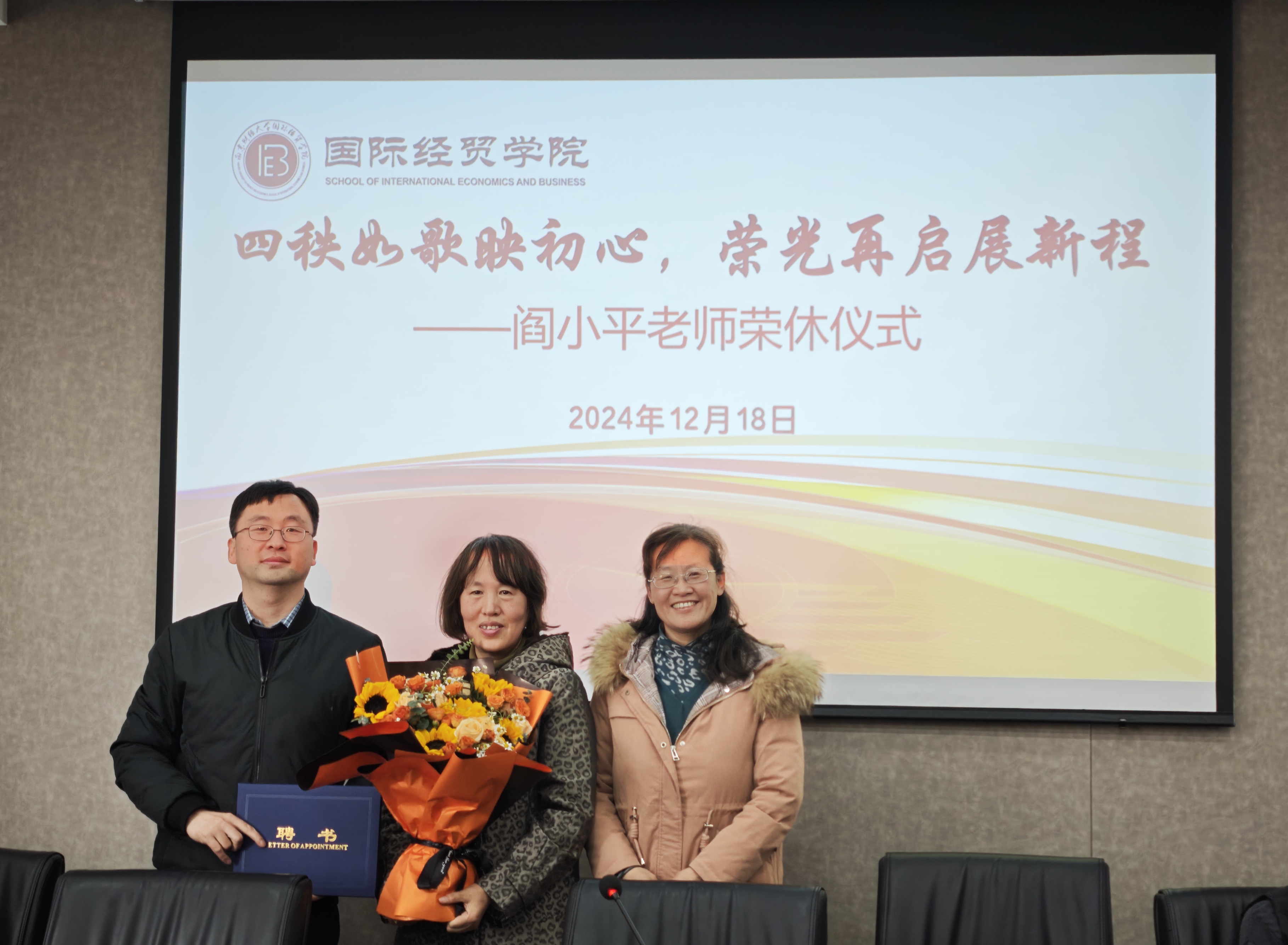 2024年12月18日下午,国际经贸学院在德经楼308会议室举办“四秩如歌映初心,荣光再启展新程”阎小平老师荣休仪式。学院全体院领导、全体教职工参加了荣休仪式,院党委周亚芳书记主持了仪式。