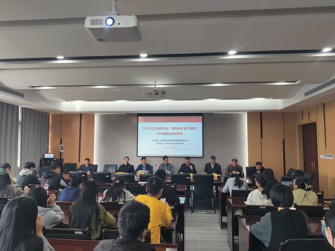 2025年11月16日,由江苏省经济学类研究生教育指导委员会主办、南京财经大学国际经贸学院承办的江苏省研究生“经纬全球智汇商贸”学术创新论坛在南京财经大学仙林校区成功举办。论坛由国际经贸学院副院长陈启斐教授主持,江苏省经济学类研究生教育指导委员会秘书长张成教授和南京财经大学国际经贸学院院长余泳泽教授分别致辞,学院盛情邀请6名知名专家学者莅临指导,大会聚焦全球经贸格局变革、数字经济与贸易转型等前沿议题,为服务经贸领域新发展格局贡献学术智慧,并围绕研究生高质量培养问题开展专题讨论。