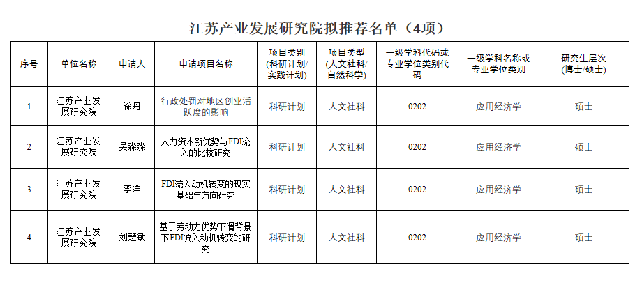 根据省学位办《关于做好2023年江苏省研究生科研与实践创新计划项目和学位与研究生教育教学改革课题申报工作的通知》(苏学位办函〔2023〕4号)的文件精神,学院采取双向匿名评审、导师回避的方式确定了2023年江苏省研究生科研与实践创新计划项目的拟推荐名单,现予以公示。