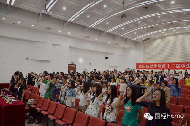 而后主持人宣布第十二届国经院学生会成立,并由学生会主席梁枫带领全体成员宣誓.会场气氛高涨,并以热烈的新生提问结束.