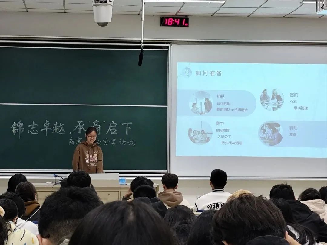 为帮助同学们了解商赛的具体内容与注意事项,为今后的商赛实操打下基础,11月11日晚,我院在德经楼101教室举行“锦志卓越 承‘商’启下”商赛经验分享会,此次活动邀请到了国贸2104班的陈雪子、王国磊同学,以及国贸2204李苏妍同学进行经验分享与技巧传授。