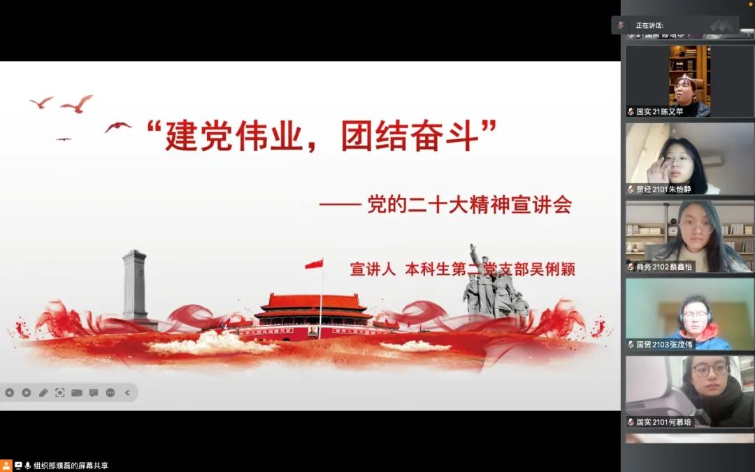 1月9日,党的二十大精神师生宣讲团成员国贸2004的吴俐颖同学从新时代的伟大成就、深入学习宣传贯彻党的二十大精神、新时代新要求新标准三个方面入手,号召我院青马班成员深入学习贯彻党的二十大精神。